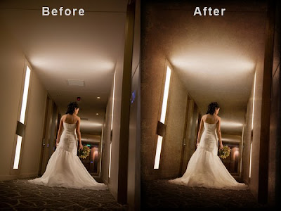 This is about as heavy handed as we get. Any distracting elements in the hallway have been removed (green exit signs, smoke alarm, air-conditioning vents etc). We have also overlayed a texture and burnt in the edges to add some drama. The bride herself has not be altered in anyway.